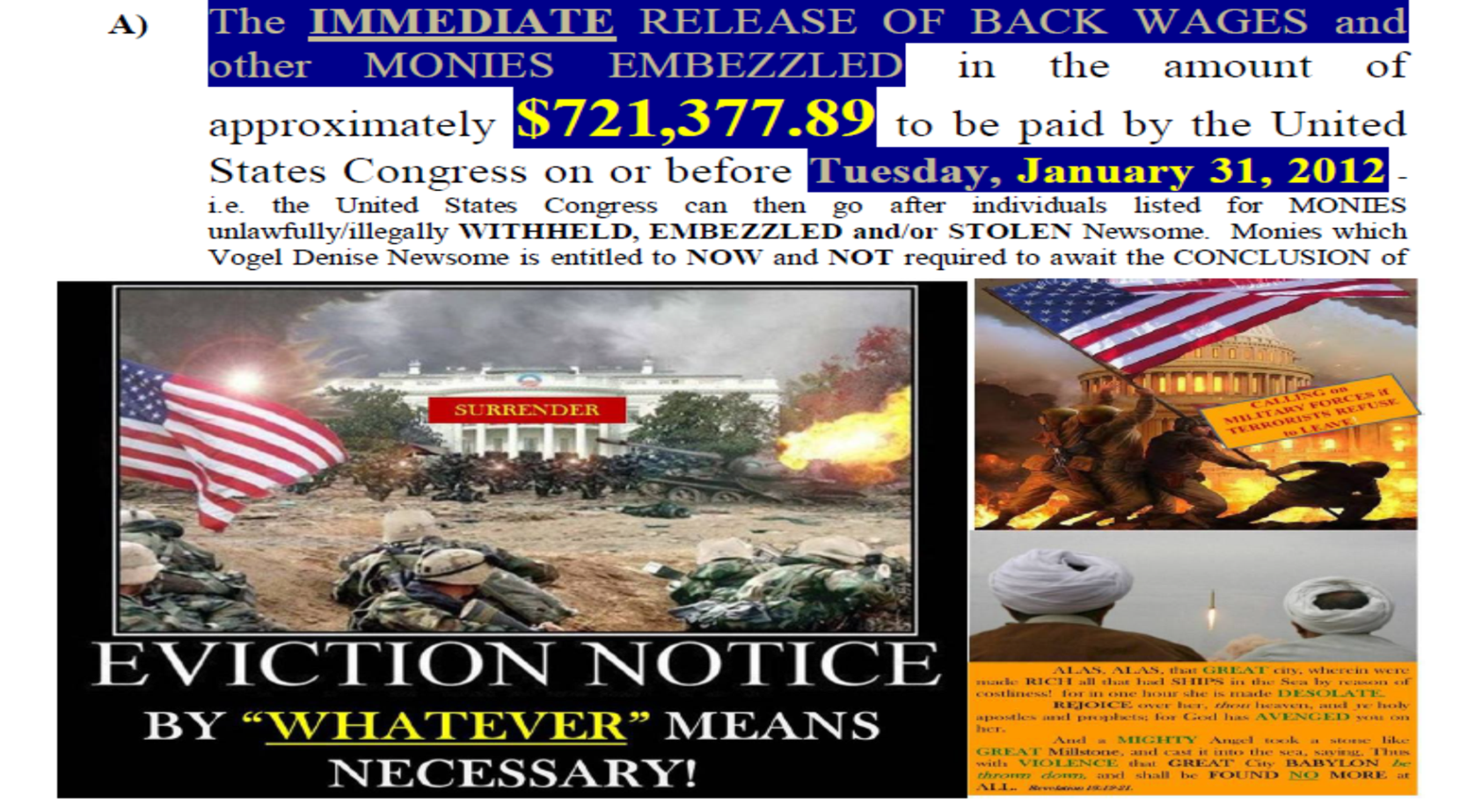On March 25, 2019, conspiracies CONTINUED to be launched against the Chickasaw Tribal Nation’s / Utica International Embassy’s Officials and / or People to have them Kidnapped and / or Assassinated “by any means necessary!” Specifically, targeting Prime Minister Vogel Denise Newsome BECAUSE of her knowledge of the Laws governing such matters and NOTIFYING the applicable “INTERNATIONAL” Tribunals, United States Officials / Legal Counsel, and Foreign Nations / Officials of LAWFUL actions being brought to bring United States Officials, Employees, Representatives, their Legal Counsel and CO-Conspirators TO JUSTICE!