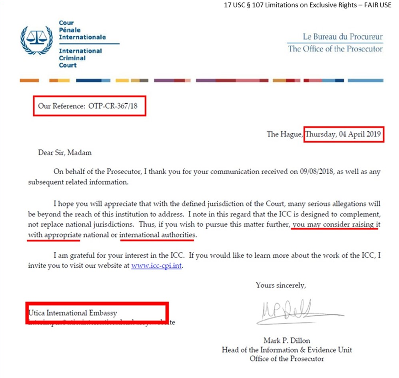 IMPORTANT TO NOTE: On or about March 25, 2019, the United States of America’s Officials, their President Donald John Trump and Legal Counsel Baker Donelson Bearman Caldwell & Berkowitz PC’s Attorneys/Lawyers CONSPIRED to have Prime Minister Newsome KIDNAPPED and for approximately 110 days (March 25, 2019 – July 12, 2019), sought ways to have her ASSASSINATED in efforts of OBSTRUCTING Justice in failed efforts of keeping Complaint(s) . . . from being filed/submitted to the United Nations and/or the “appropriate INTERNATIONAL Authorities” regarding the War Crimes, Crimes against Humanity and other Atrocities, etc. being carried out against the BLACK Indians within the Lands/Territories presently known as the United States of America. From the following image, a reasonable mind may conclude that the March 25, 2019, Kidnapping and ASSASSINATION attempts were also carried out in efforts of keeping the Chickasaw Tribal Nation’s/Utica International Embassy’s Officials from receiving the April 4, 2019, Communication from the International Criminal Court.