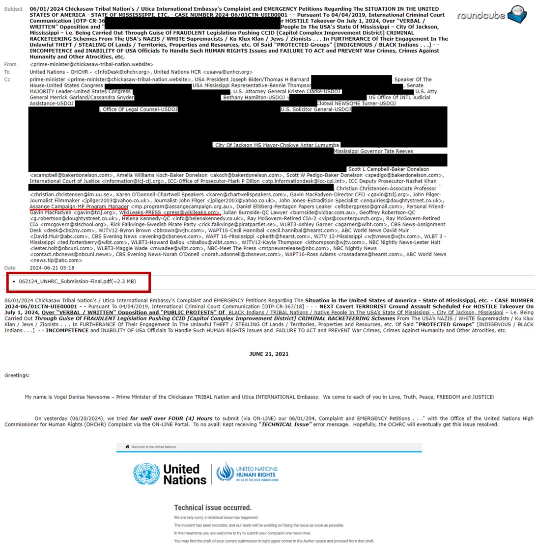 On June 21, 2024, NOTIFICATION regarding problems with filing of the Chickasaw Tribal Nation’s/Utica International Embassy’s COMPLAINT/Emergency Petitions . . . was reported. Assange’s Legal Team and/or Contacts being included in EMAIL(S)!